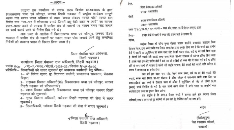 टिहरी गढ़वाल एवं उत्तरकाशी जिले के जिला पंचायतराज अधिकारियों के द्वारा ग्रामीण क्षेत्रों में स्वच्छ भारत मिशन आदि कार्यक्रमों के प्रचार-प्रसार करने हेतु मकानों पर नम्बर प्लेट लगाने का कार्य एक बाहरी व्यक्ति को देने से संबंधित पत्र सोशल मीडिया में वायरल हुए थे।